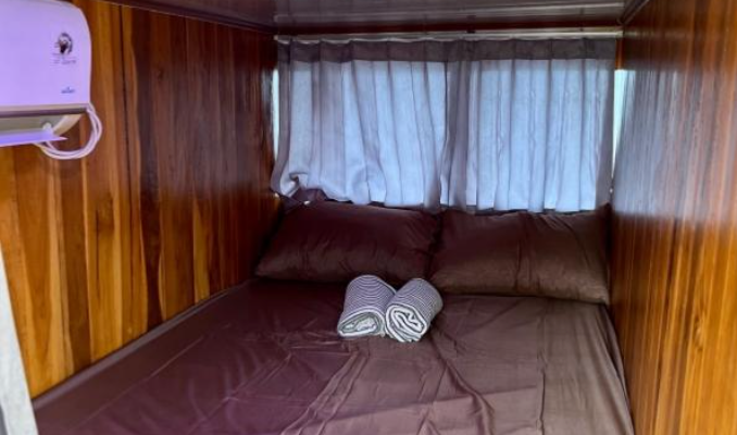 Private cabin for two persons equipped with fan, double mattress, pillow, and blanket for each guest.